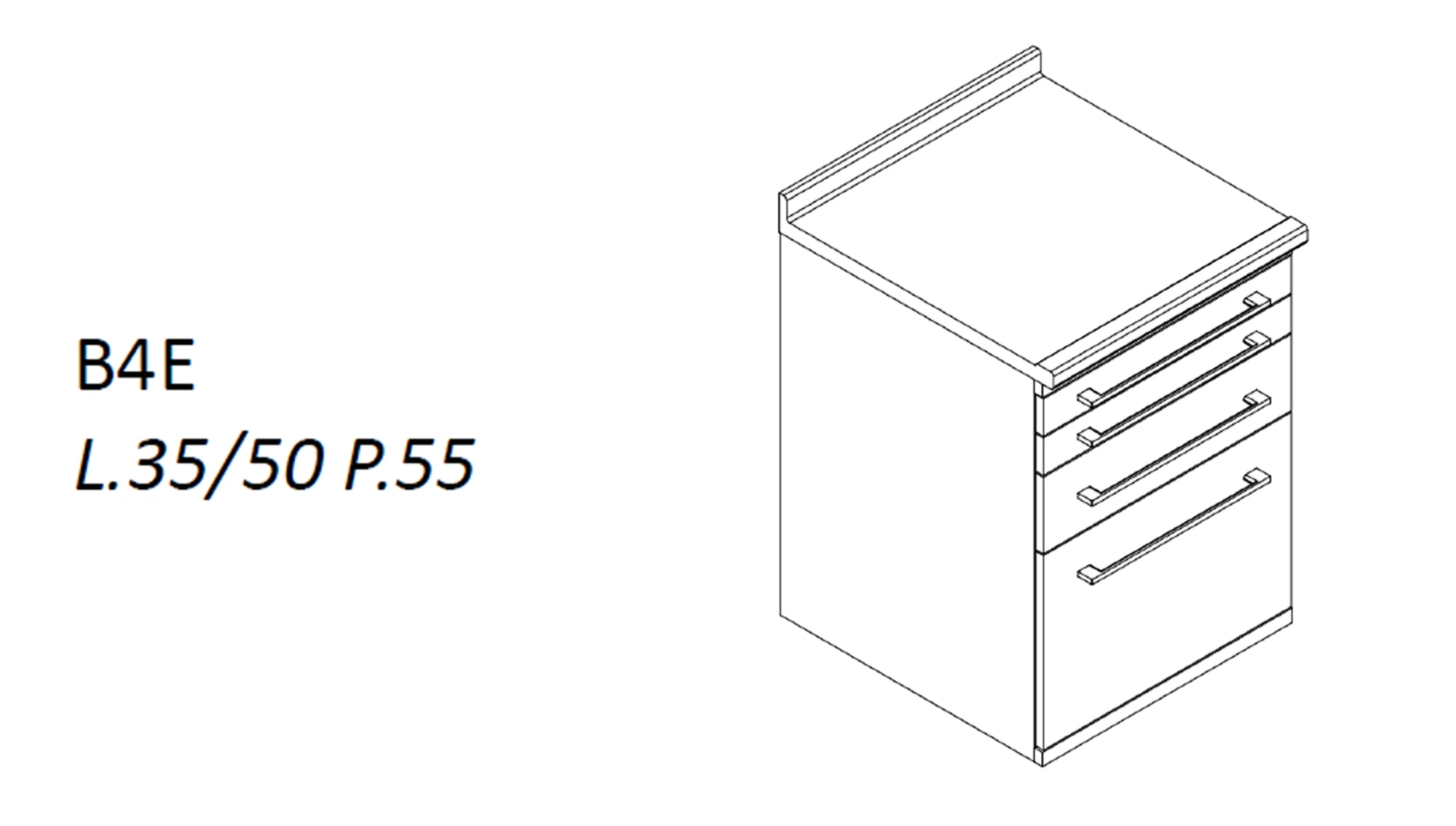 Il mobile di servizio B4E è un elemento della linea BRIDGET progettato per coniugare ordine e versatilità. La sua configurazione prevede due cassetti superiori di dimensioni standard, un cassetto intermedio più ampio e un cassetto inferiore capiente, offrendo così spazi differenziati per strumenti, materiali e dispositivi di varie dimensioni.