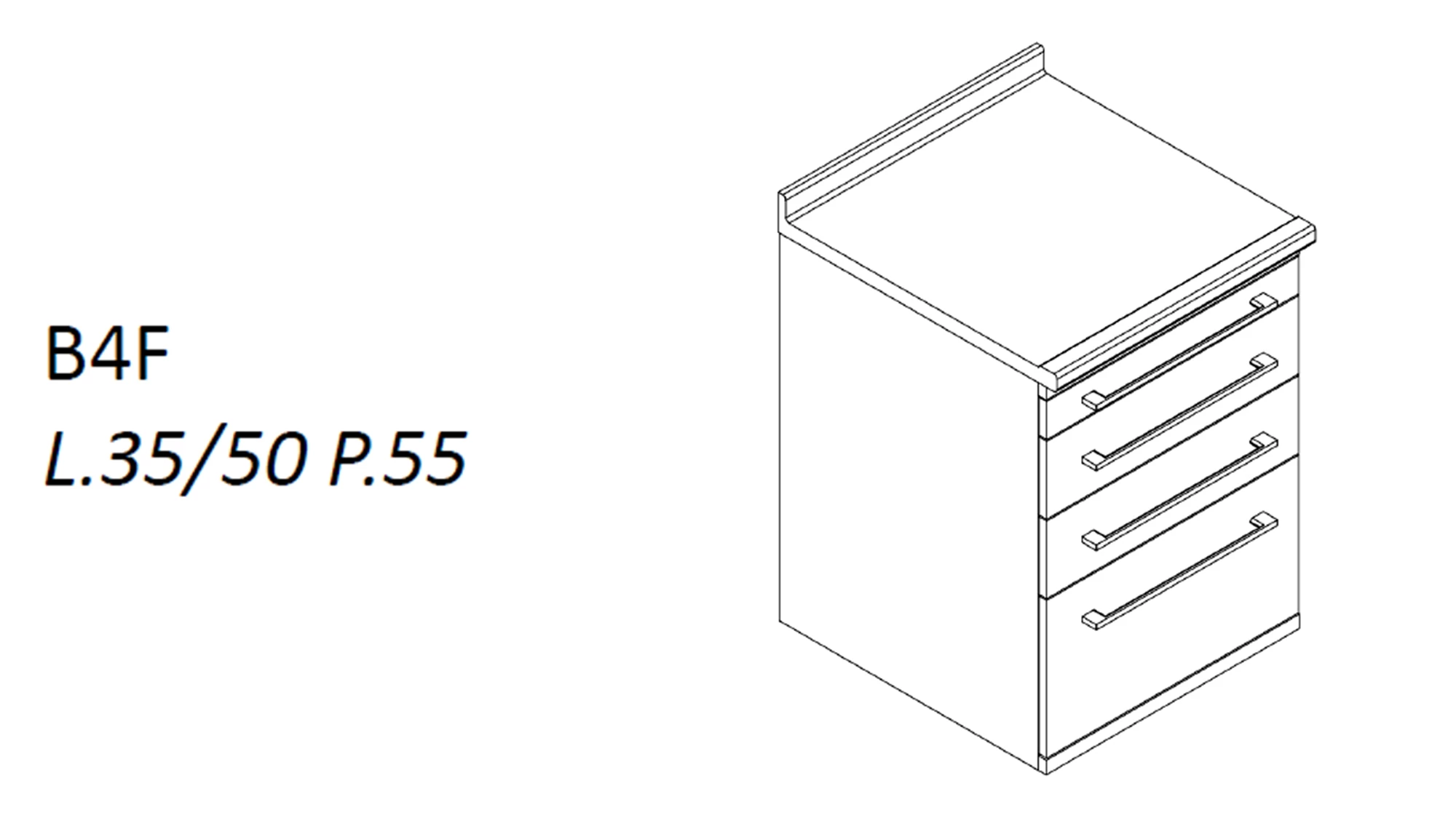 Rispetto al B4D (quattro cassetti uguali) e al B4E (due piccoli, uno medio e uno grande), il B4F si distingue per il cassetto inferiore ancora più capiente, che garantisce maggiore capacità di contenimento per strumenti ingombranti o confezioni di grandi dimensioni.